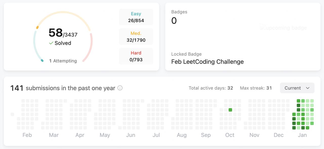 С начала января я завел себе странную привычку — решаю задачки на LeetCode каждый день. Хотя, это пока сложно назвать привычкой, поскольку бывают дни когда нужно заставлять себя это делать. Толчком стал тред в вастрик клубе, где люди делились своими профилями и прогрессом. Вообще, лет пять назад я уже баловался с алгоритмическими задачами, но на сodewars.